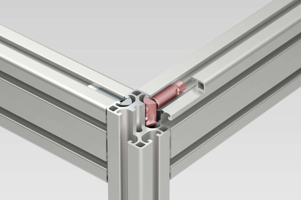Durch die innovative Gewindeform, die für noch mehr Halt in der Nut 8 sorgt, ist der Automatik-Verbindungssatz 8 S von Item axial besonders belastbar. Bei der Montage zeigt sich der Verbinder besonders anwenderfreundlich: Die vormontierte, unverlierbare Schraube wird direkt mit dem Verbinder in die Nut eingedreht und kann sofort festgezogen werden. Vor allem bei Profilen mit geschlossenen Nuten spart dieser Ablauf wertvolle Zeit. Der Automatik-Verbindungssatz 8 S 40 verfügt über einen Nutenstein mit zwei Gewinden und zwei Automatikverbindern. Damit lässt sich die paarweise Verwendung besonders effizient umsetzen, was den Bau von Räumen und Ständerwerken deutlich beschleunigt. Der Automatik-Verbindungssatz F 8 S 40 wiederum kombiniert einen Nutenstein F mit zwei Gewinden und einem zusätzlichen Gewindestift. Dieser ermöglicht die sichere Vorpositionierung und schafft zugleich eine ESD-sichere Profilverbindung, indem die Eloxal-Schicht aufgebrochen wird.