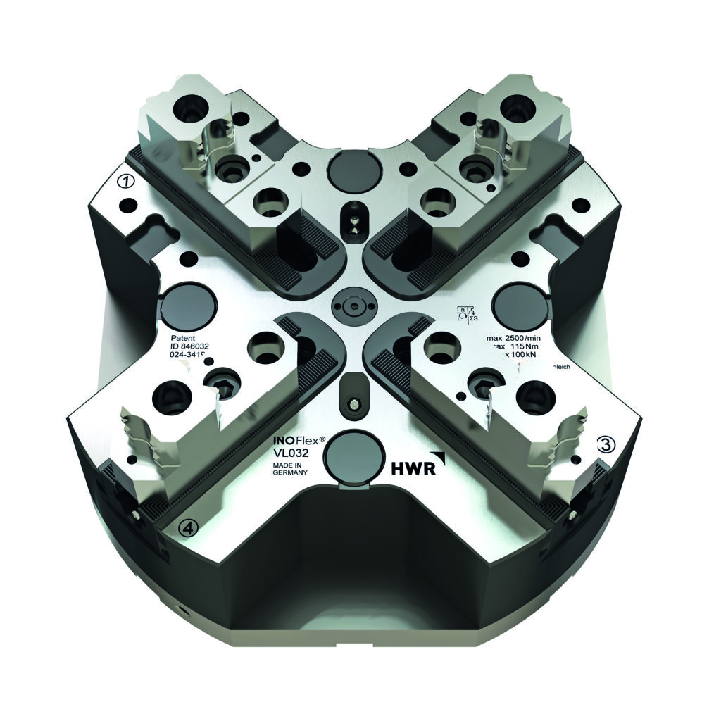 Mit den Spannmittel aus der Reihe InoFlex lassen sich dank der zentrisch ausgleichenden 4-Backen-Spanntechnik auch geometrisch unförmige Werkstücke spannen. Die von HWR selbst entwickelte und patentierte Ausgleichsmechanik stellt sicher, dass an allen Spannpunkten die gleiche Spannkraft anliegt – unabhängig von der Bauteil-Geometrie, vom jeweiligen Werkstoff oder von der Art der Bearbeitung.