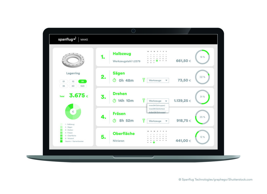 Spanflug präsentiert auf der AMB am Stand EO114 eine deutlich erweiterte Version seiner Software-as-a-Service-Lösung Make. Diese zeigt die automatisch berechneten Kosten und Fertigungszeiten übersichtlich in einer neuen Arbeitsplan-Struktur an. Dies macht zum einen die Kalkulation leichter nachvollziehbar, da die Ergebnisse gegliedert nach Arbeitsgängen einsehbar sind. Zum anderen werden Anwender noch besser in der Arbeitsvorbereitung unterstützt. Spanflug Make ermöglicht in der neuen Version nun bereits in der Angebotsphase eine präzise, automatisierte und datengestützte Planung aller benötigten Fertigungsschritte, Werkzeugmaschinen und Werkzeuge, Halbzeuge, sowie die Zeiten für das Programmieren, Rüsten und Fertigen. Diese Daten können Anwender über eine Export-Funktion unkompliziert in das ERP-System übernehmen – beispielsweise werden bei der Artikeldefinition jetzt auch Fertigungsschritte mit Maschinen, Werkzeugen und Zeiten mit übertragen. Alternativ können sie sich die Informationen auch in Form eines Arbeitsplans mit der Abfolge aller Arbeitsgänge ausgeben lassen.