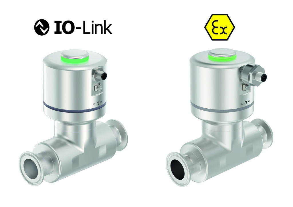 Zwei Neuheiten für Typ 8098 FLOWave S: Die IO-Link-Variante (links) unterscheidet sich optisch nicht von den bereits verfügbaren FLOWaves, die HazLoc-Variante (rechts) zeigt die spezielle Steckverbindung.