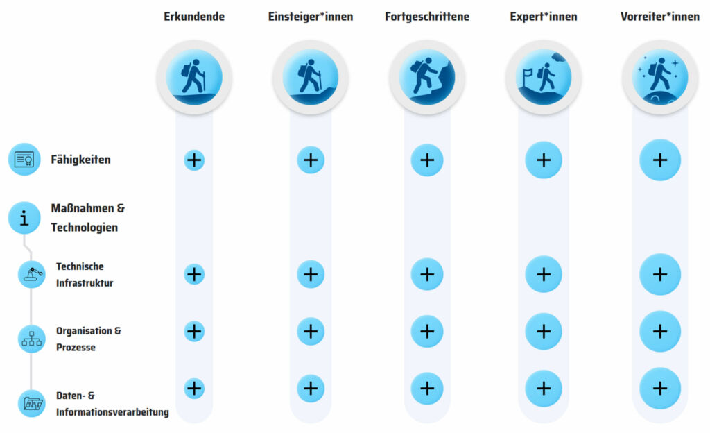 Der Skill-Tree des ReSET 4.0-Tools bildet aufeinander aufbauende Entwicklungsstufen ab und hilft Nutzenden herauszufinden, welche Ressourceneffizienzpotenziale sie mittels digitaler Lösungen erschließen können.