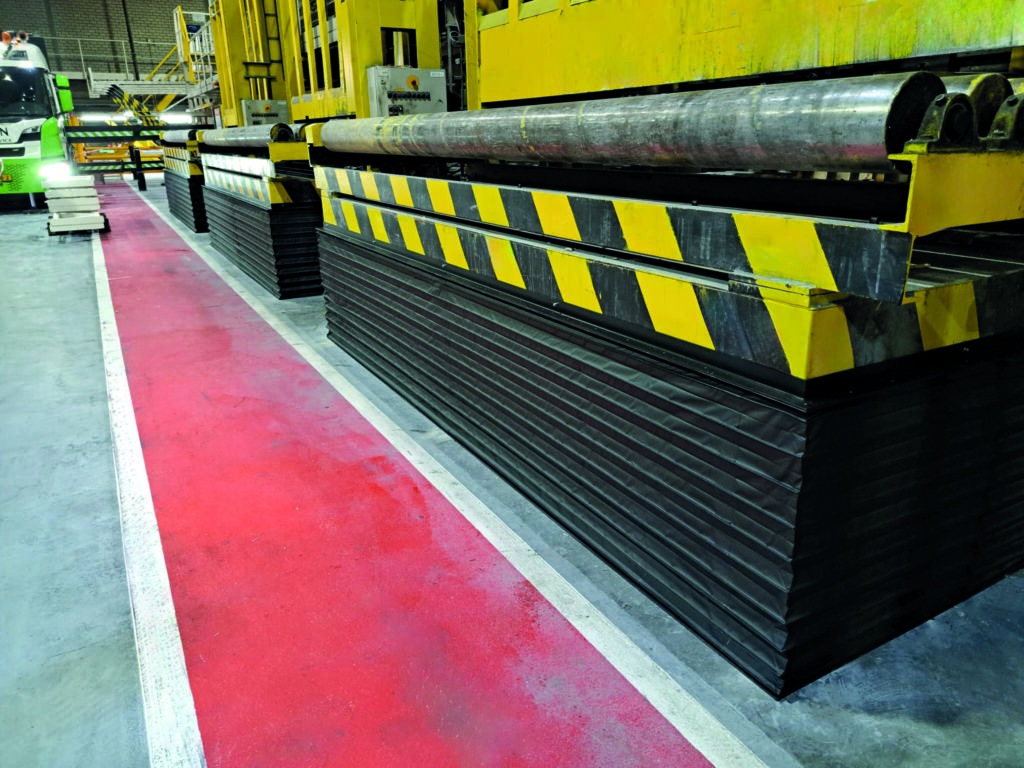 Die maßgeschneiderten Faltenbälge schützen passgenau die Scherenkonstruktion der Hubtische vor Eingreifen und Unterfahren.